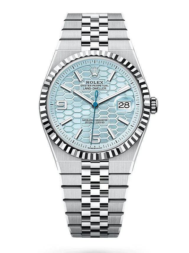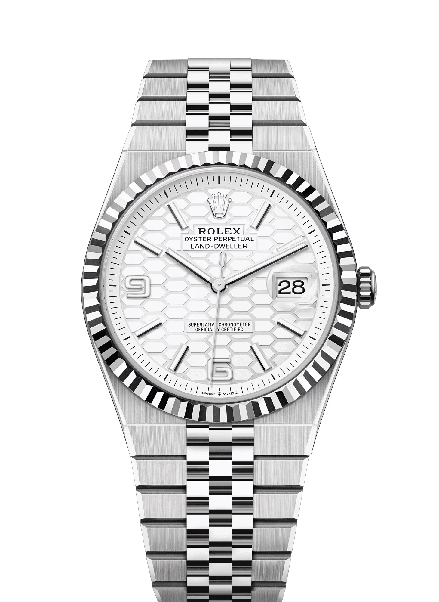 The Land-Dweller reinvents the complex and challenging design of watches with integrated bracelets. It comes equipped with a completely new metal bracelet – the Flat Jubilee – which integrates perfectly with the Oyster case. The Land-Dweller features an Oyster case with an exclusive design. The bezel, fluted or set with diamonds, displays a richly detailed dial with a honeycomb pattern.